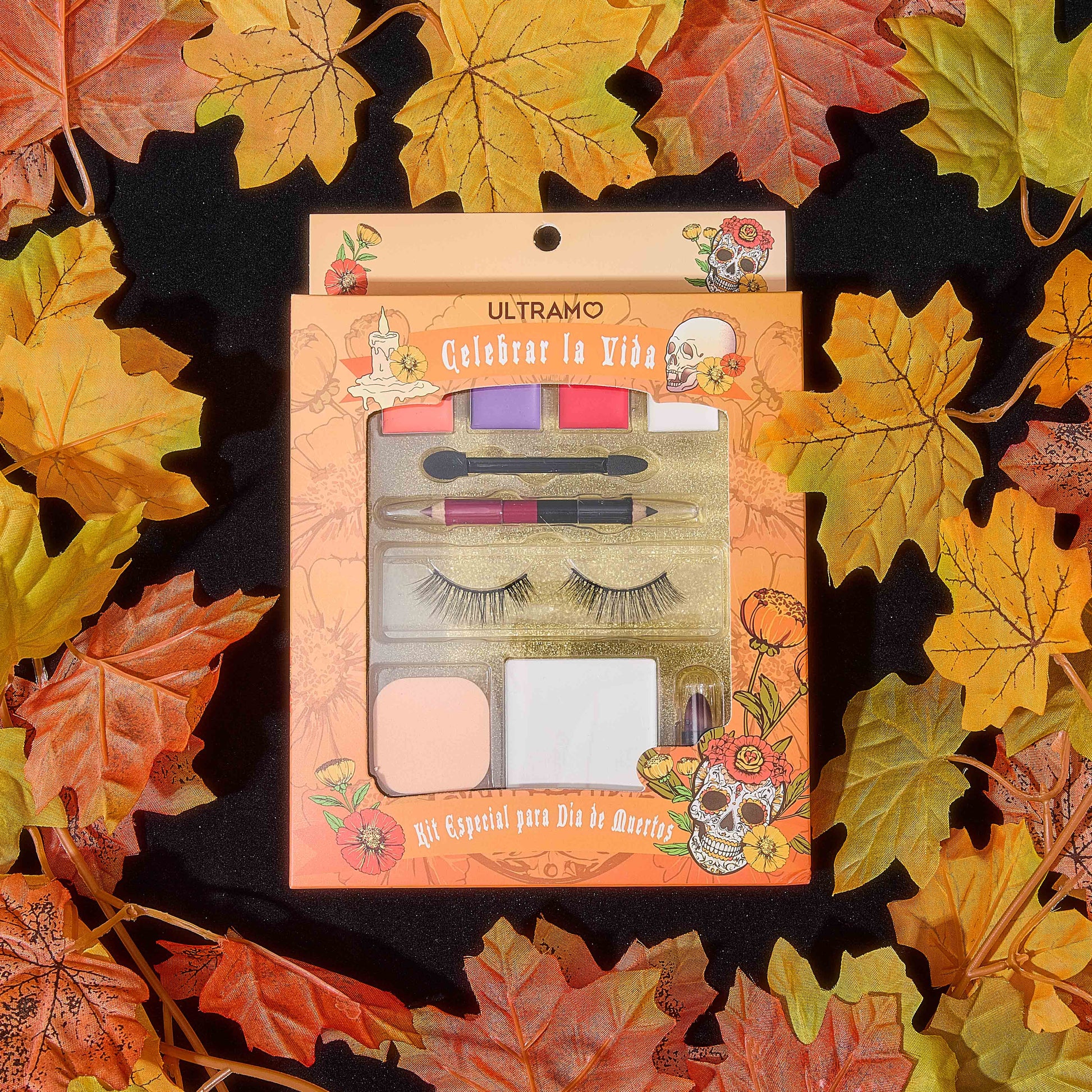 This special Day of the Dead kit includes 1 white compact powder, 1 small makeup powder puff, 1 pair of glamorous eyelashes, 1 double-ended lip liner, 1 duo brush, and 1 face paint palette. Each product is high-quality and absorbs quickly, perfect for creating a special and incredible Day of the Dead look.