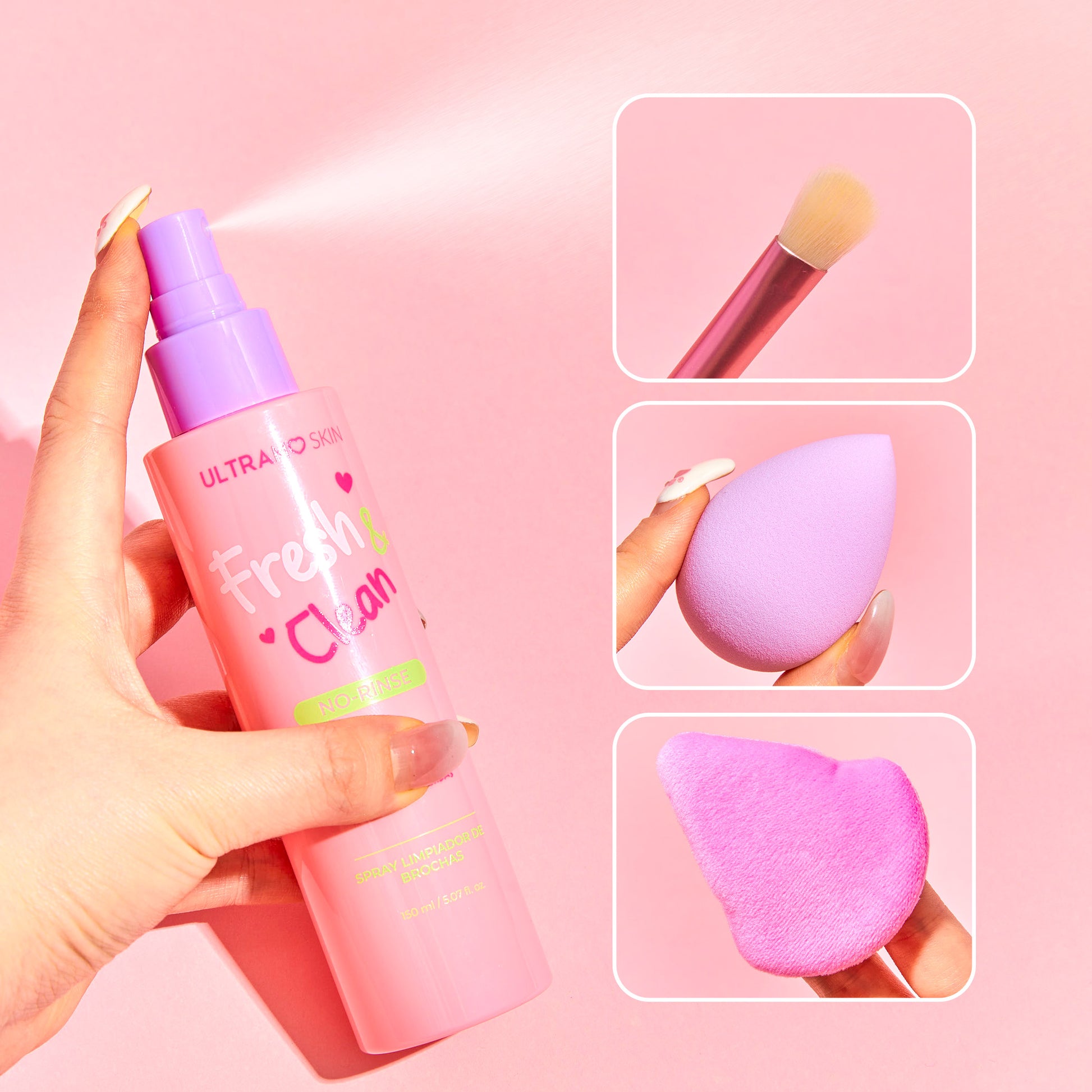 Mantén tus herramientas de maquillaje limpias con nuestro limpiador para brochas en spray. Su fácil aplicación y fórmula segura son gentiles con tus brochas mientras eliminan residuos de maquillaje, suciedad y aceites.