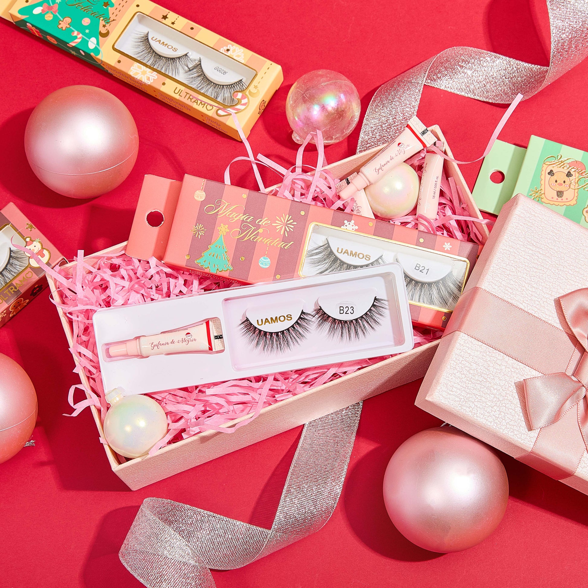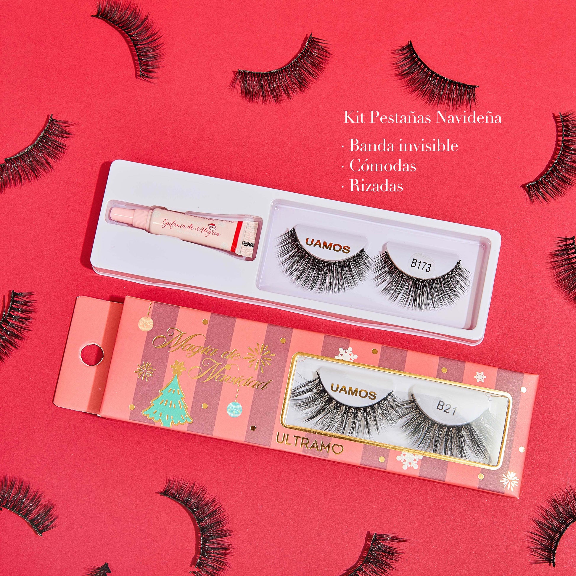 Resalta tus ojos en esta temporada navideña con nuestro kit de pestañas que viene con pegamento incluido. Están hechas con una banda invisible que te hace lucir una mirada más natural y cómodas de usar. Su rizado en la punta hace que las pestañas sean mucho más voluminosas.